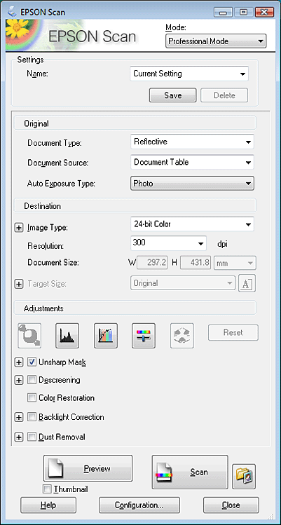 Scanning in Professional ModeWhen you select Professional Mode, you see the Epson Scan Professional Mode window.