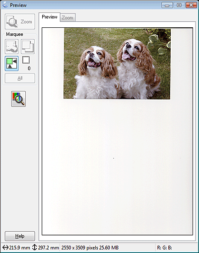 To zoom in on an image, click inside the scan area and click the Zoom button. Epson Scan prescans again and displays a larger preview on the Zoom tab.
