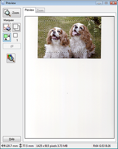 Once you have selected your scan size, you can click and drag the marquee to the area in the image you want to scan. For details, see Creating a Marquee on a Preview Image. The marquee proportions are retained as you adjust it.