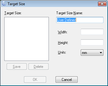 Type a name for your custom size, enter the size, click Save, then click OK. Your new size appears in the Target Size list.
