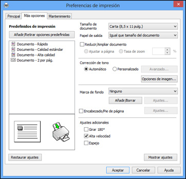 impresión para su documento en la ficha Más opciones.