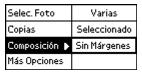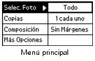El Menú principal de la impresora le ofrece flexibilidad a la hora de seleccionar las fotos y la manera en que desea imprimirlas. Podrá seleccionar, por ejemplo, composiciones de página que le permiten imprimir fotos tamaño cartera o con márgenes.