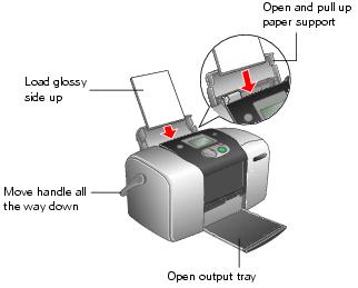 Note: Keep the PictureMate handle to the back, under the paper feeder and all the way down, to allow paper to feed through.