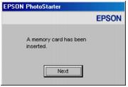 - If this is the first time you've inserted a memory card, you see the message below. Follow the instructions in Configuring PhotoStarter to respond to the message.