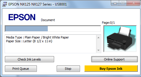 During printing, you see this window showing the progress of your print job. It allows you to control printing and check ink cartridge status.To see print jobs lined up for printing, click Print Queue.To check ink status, click Check Ink Levels.If you see an error during printing, see Solve Problems for solutions.