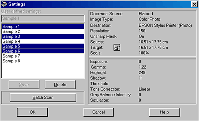 To scan a single image with several different settings, make and save each group of settings as described above. Then hold down the Ctrl key while clicking the custom settings you want to select in the User defined settings list. After selecting all the settings you want to use when scanning, click Batch Scan. The scanner scans the image once for each group of settings you have selected.