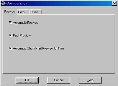 Click the Configuration button in the Manual mode window to open the Configuration dialog box. You can make a variety of preview and color adjustment settings.