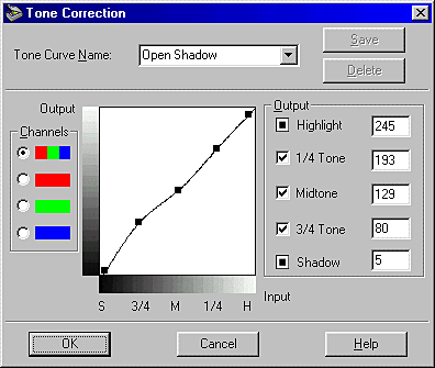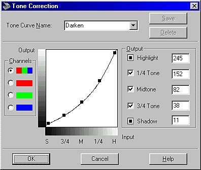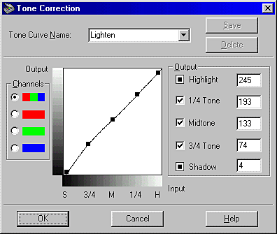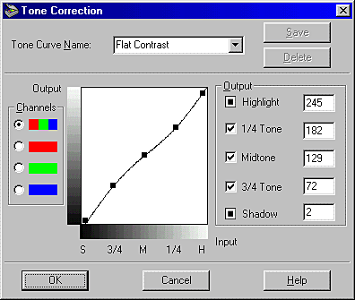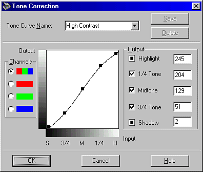 The Tone Correction feature provides preset tone correction curves that let you adjust the contrast within an image. This gives you more control over the image when used in conjunction with the settings in the Image Controls dialog box.