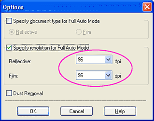When you want to view scanned images on the computer screen, set the output resolution to 96 dpi. The monitor can reproduce images only up to 96 dpi. Scanning at a high resolution is counterproductive. The low resolution image files are smaller and easy to handle. Therefore, use low resolution to scan images for use on the Internet or in e-mail.