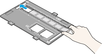Slide the edge of the strip in the 35 mm film holder, base side facing down. Then place it so that all of the frame is positioned inside the film holder.