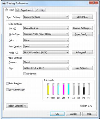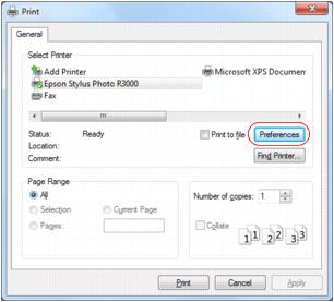 Print From a Program After you open a document or photo in a Windows program, follow these steps to access your print settings: 1. Select the print option in your application. You see a screen like this: 2. Select the name of your product. 3. Click Properties or Preferences. Note:If you don’t have these buttons, click Setup, Printer, or Options, then click Properties or Preferences on the next screen. Your printer setting window opens: Follow the steps in these sections to select settings, print, and control printing: Select Basic Options Change Print Layout Select Paper Configuration Options Select Advanced Black and White Photo Settings Print Your Document or Photo Check Printing Status See also: Customize the Printer Driver Change Default Print Settings