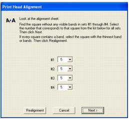 5. Look at the four sets of patterns in your printout. For each set, if you see a pattern with no visible vertical lines, enter its number in the corresponding box on the screen and click Next.If you can’t find an aligned pattern, choose the one that’s closest to being aligned. Click Realignment and then Print to print another alignment sheet and repeat this step.