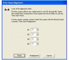 7. Look at the four sets of patterns in your printout. For each set, if you see a pattern with no visible vertical lines, enter its number in the corresponding box on the screen and click Finish to close the Print Head Alignment Utility.If you can’t find an aligned pattern, choose the one that’s closest to being aligned. Then click Realignment to print another alignment sheet and repeat this step.