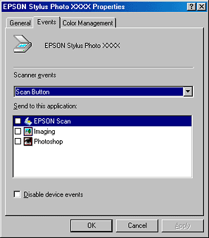If you need to disable Scanner events, select the Disable device events check box in the scanner's Properties dialog box.