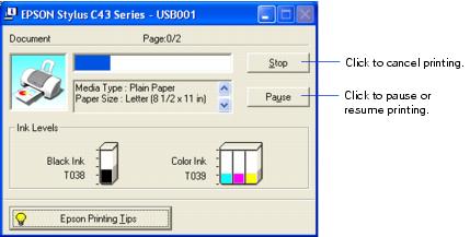 After a moment, this window appears and shows the progress of your print job. You can use the buttons to cancel, pause, or restart printing. You can also see how much ink you have left.