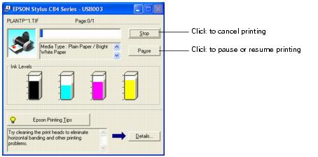 During printing, this window appears and shows the progress of your print job. You can use the buttons to cancel, pause, or resume printing. You can also see how much ink you have left.