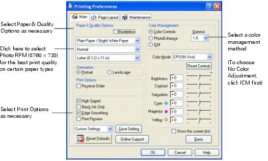 ) on selected papers, click the Advanced button on the Main tab. Then see Customizing Windows Print Settings for instructions on selecting Photo RPM.