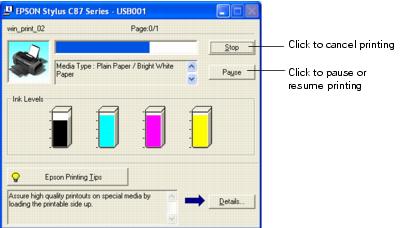 During printing, the following window appears to show the progress of your print job. You can use the buttons to cancel, pause, or resume printing. You can also see how much ink you have left.