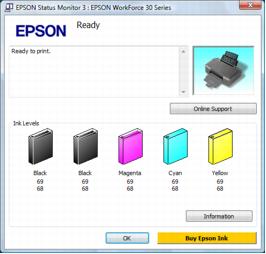The WorkForce 30 Series requires two black ink cartridges. If you install different sizes of black ink cartridges (one high capacity and one standard capacity) in the printer at the same time, the black ink level indicators in the printer software may show one black cartridge being used more quickly than the other. This is normal. Please note that the ink level indicators in the printer software are estimates only.