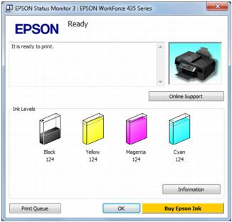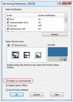 A window may also appear on your computer screen when you try to print when ink is low. To disable the low ink reminder window, right-click theprinter icon in the bottom-right corner of your screen and select Monitoring Preferences. Then uncheck the Enable Low Ink Reminder checkbox.