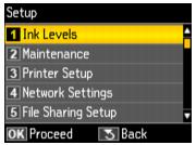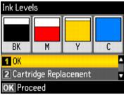 Check Ink Status From the LCD Screen You can check the ink cartridge status using the LCD screen on your product. 1. Press the Setup button. 2. Select Ink Levels. 3. The ink cartridge status is displayed. Check the ink levels and replace a cartridge, if necessary. 4. Press OK to exit. You can also check the ink cartridge status using your Windows or Macintosh software. If one of the screens indicates that a cartridge is expended, replace the cartridge.