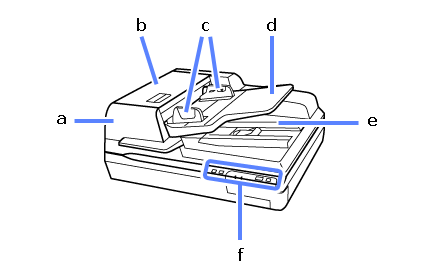 a. Automatic Document Feeder (ADF) b. ADF cover c. edge guides d. ADF input tray e. ADF output tray f. control panel