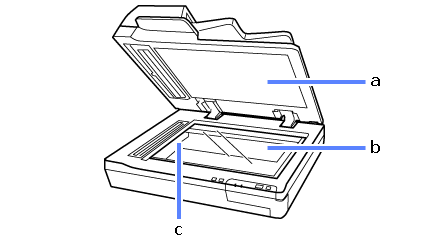 a. document cover b. document glass c. carriage (in the document glass)