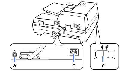 a. USB port b. AC inlet c. transportation lock lever